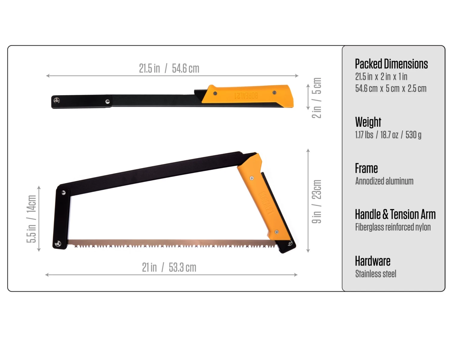 The versatile and precise Boreal21 folding bow saw is perfect for camping, backpacking, canoeing, hunting, trail clearing or around the home use. Automatic blade tensioning with no loose parts makes it easy to open in seconds. Simply unfold, snap into position and start sawing. The effective and ergonomic design provides a high clearance and allows for larger diameter cuts. The blade safely folds into the frame when not in use, protecting you and your gear.