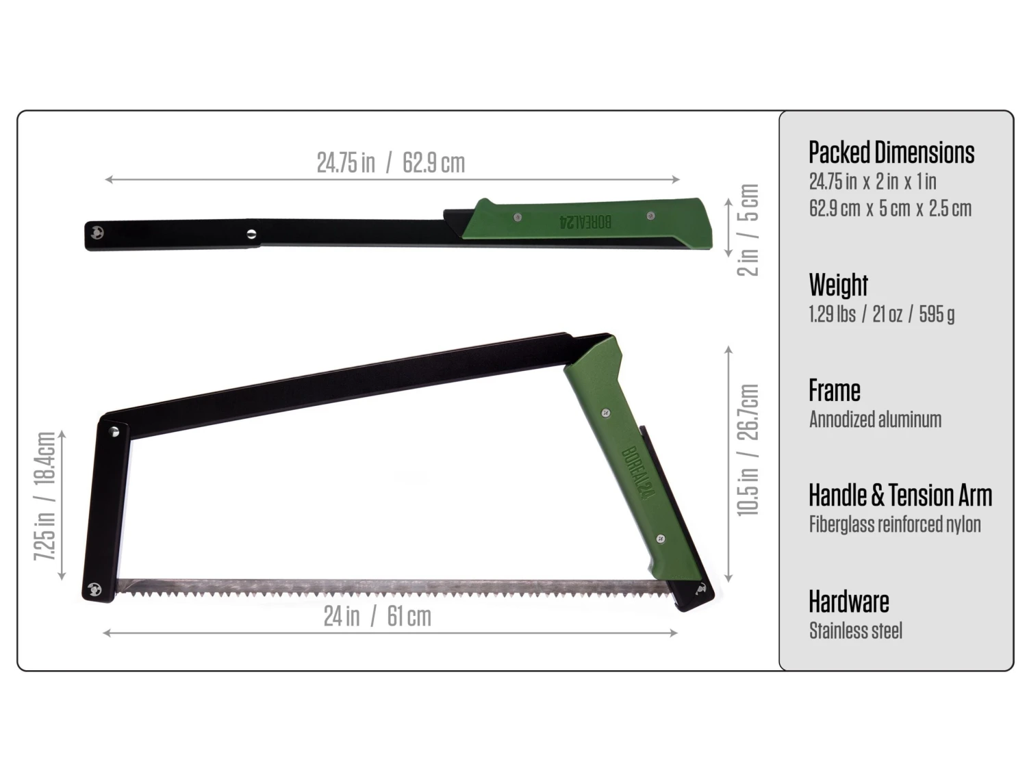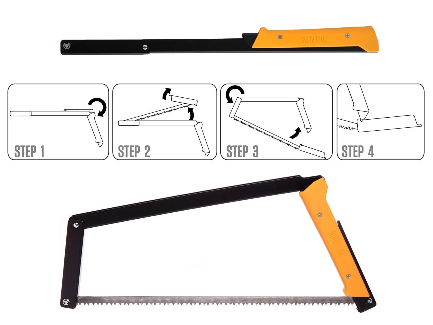 The highly efficient Boreal24 folding bow saw is perfect for camping, backpacking, canoeing, hunting, trail clearing or around the home. Automatic blade tensioning with no loose parts makes it easy to open in seconds. Simply unfold, snap into position and start sawing. The ergonomic design provides a high clearance and allows for larger diameter cuts. The blade safely folds into the frame when not in use, protecting you and your gear.