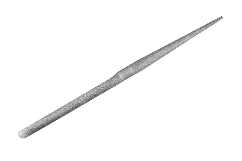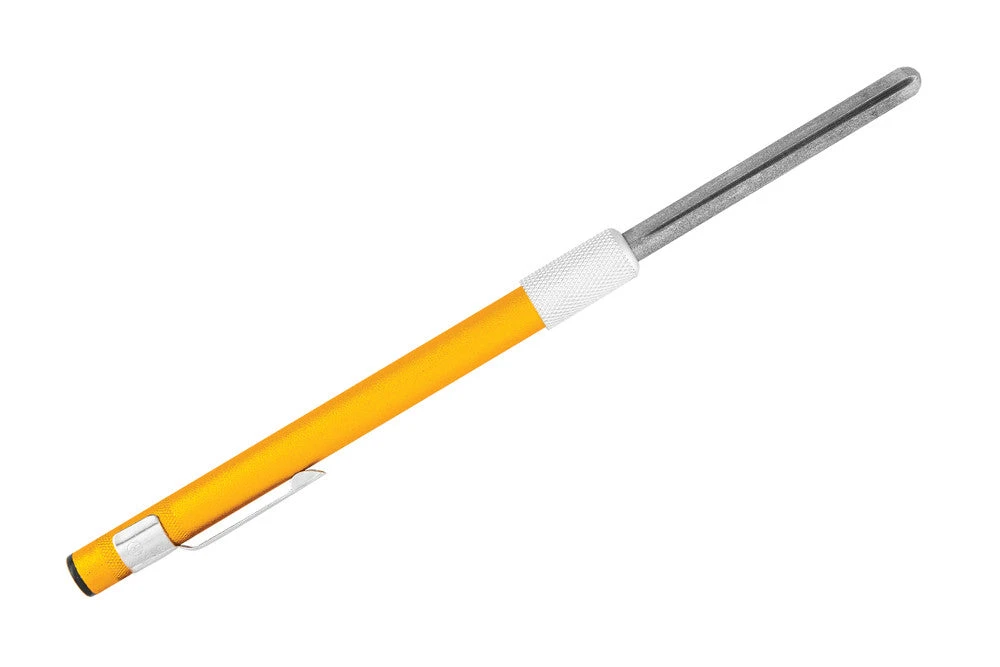 Diamond knife sharpener in a retractable, pen style barrel. Tapered end for serrated blades. Fish hook groove to sharpen your hooks. Flat side for straight blades. Portable, versatile, and durable enough for field use.