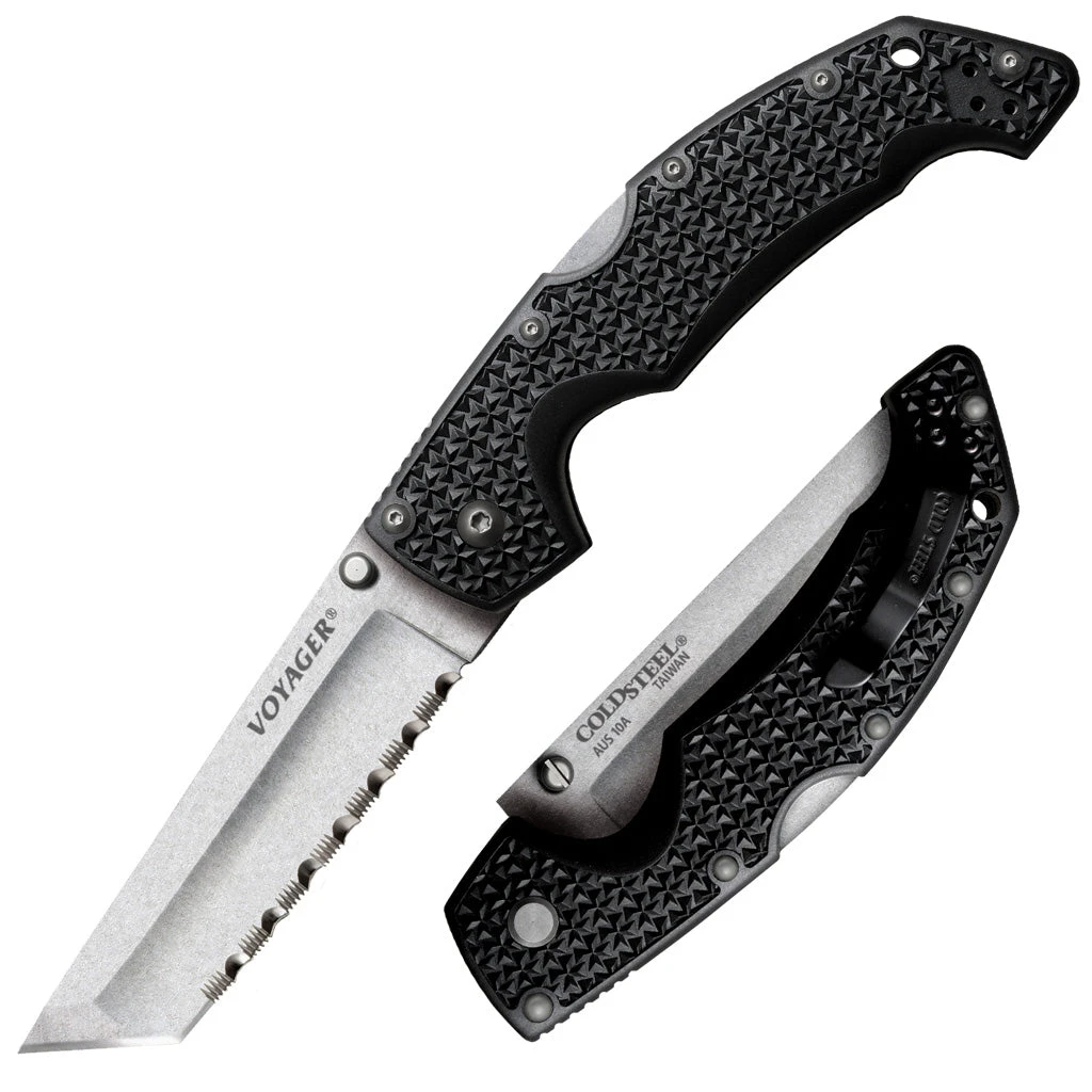 The Cold Steel Voyager series is designed to be the true “everyman” knife. Lightweight, comfortable and super sharp, they are rugged, dependable and perfect for hunting and camping as well as general utility and daily cutting chores. Voyagers excel in many survival and rescue applications, and they have proven to be very popular with Police and Military personnel, who appreciate the combination of cutting performance and safety that they offer. Each knife in our extensive Voyager series is precision engineered and held to our most exacting standards. The Voyager series features Japanese AUS10A Alloy Blades and our Tri-Ad locking mechanism – which is quite possibly the most secure, safe and shock resistant lock on the market today! The Voyager’s ergonomic Griv-Ex handles (reinforced with heat treated 6061 aluminum liners) provide both great comfort and a secure grip even under extended use in tough conditions. Available in two sizes and with numerous blade and edge configurations, there’s a Voyager for everyone.