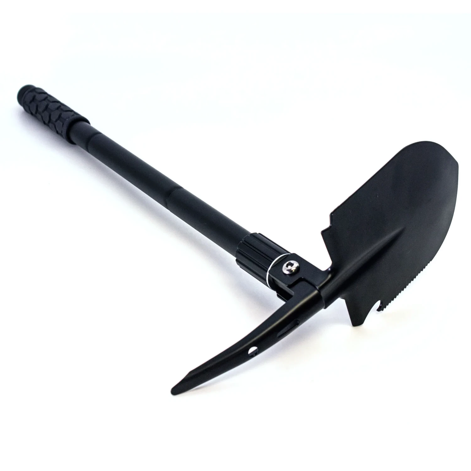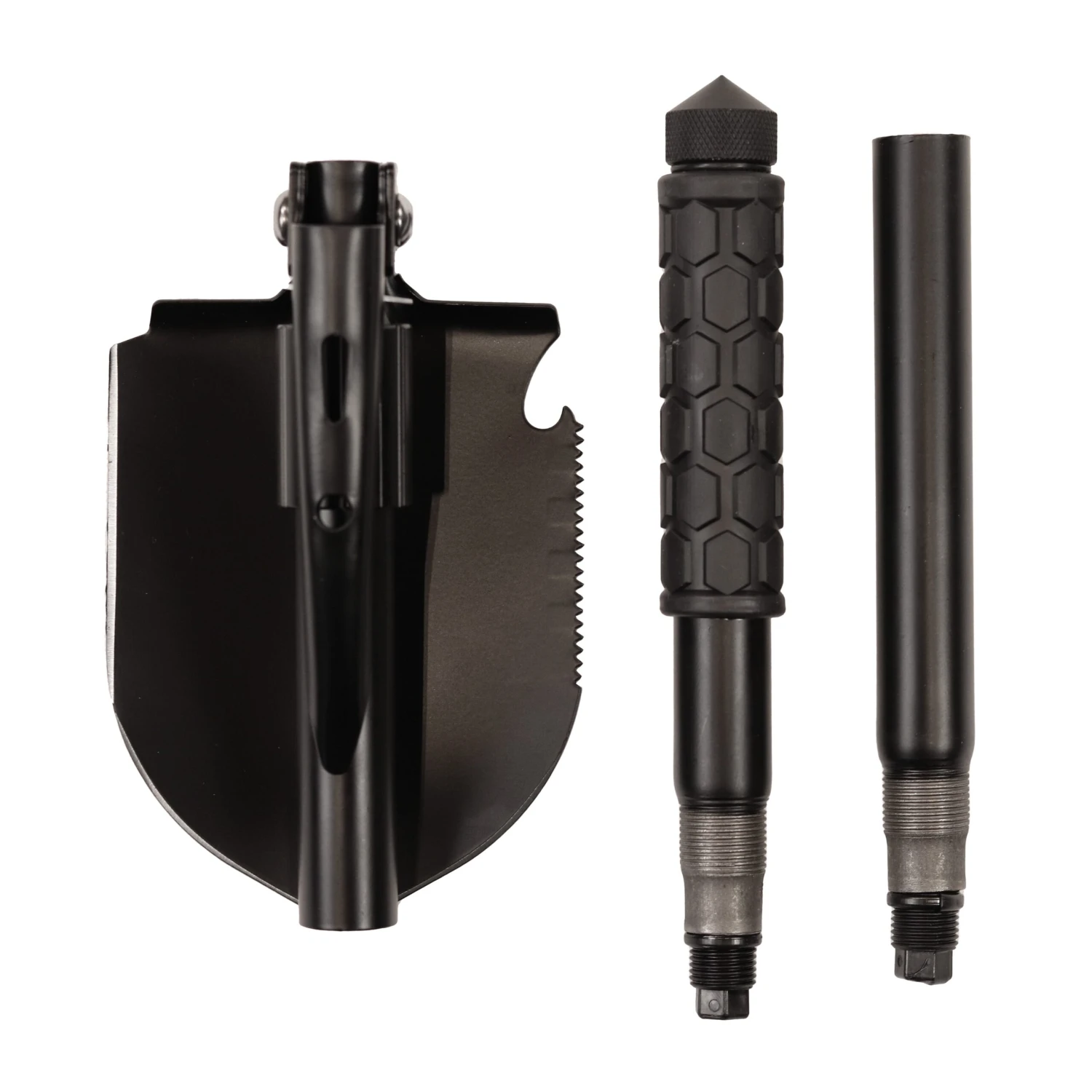 - 12-in-1 Tool: This folding shovel is more than it appears, it is a shovel, hoe, serrated blade, pick, nail puller, bottle openers, a hatchet edge, a serrated edge, a blade, signal whistle, ferro rod, and a glass breaker.