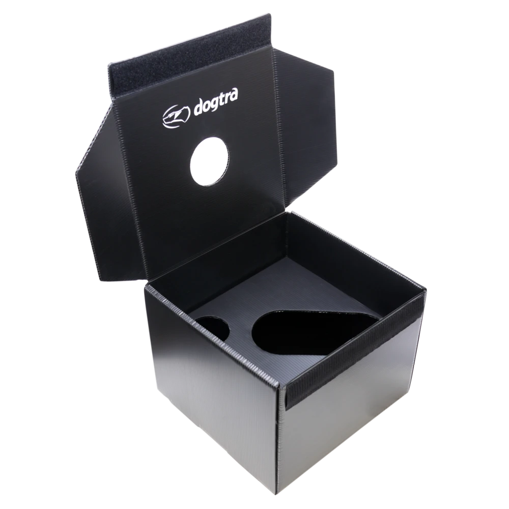 Light weight and durable, the Dogtra Training Box is made out of fluted polypropylene sheets to provide the least distracting material odour. Its light weight and durable structure allows for versatility and portability during and after detection training sessions. The top cutout is placed perfectly for the launcher part of the Dogtra BALL TRAINER.