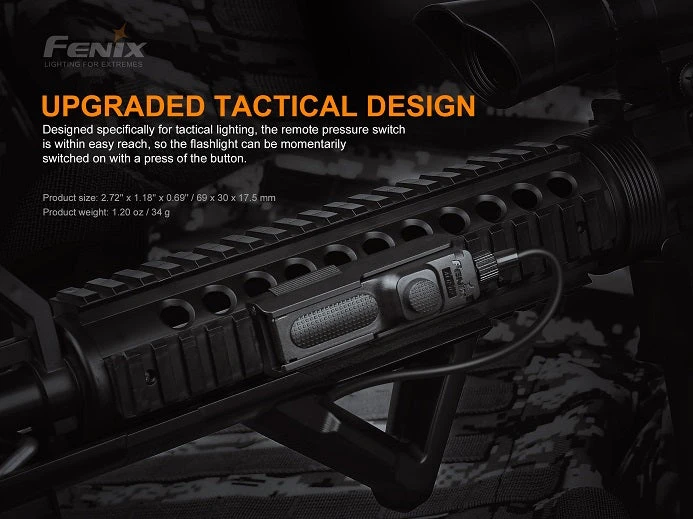 Fenix ALG-05 tactical remote pressure switch mount is specially designed for the newer Fenix AER series tactical remote switches. It attaches to a Picatinny rail by a simple push of the quick release, making for quick and tool free assembly and disassembly.