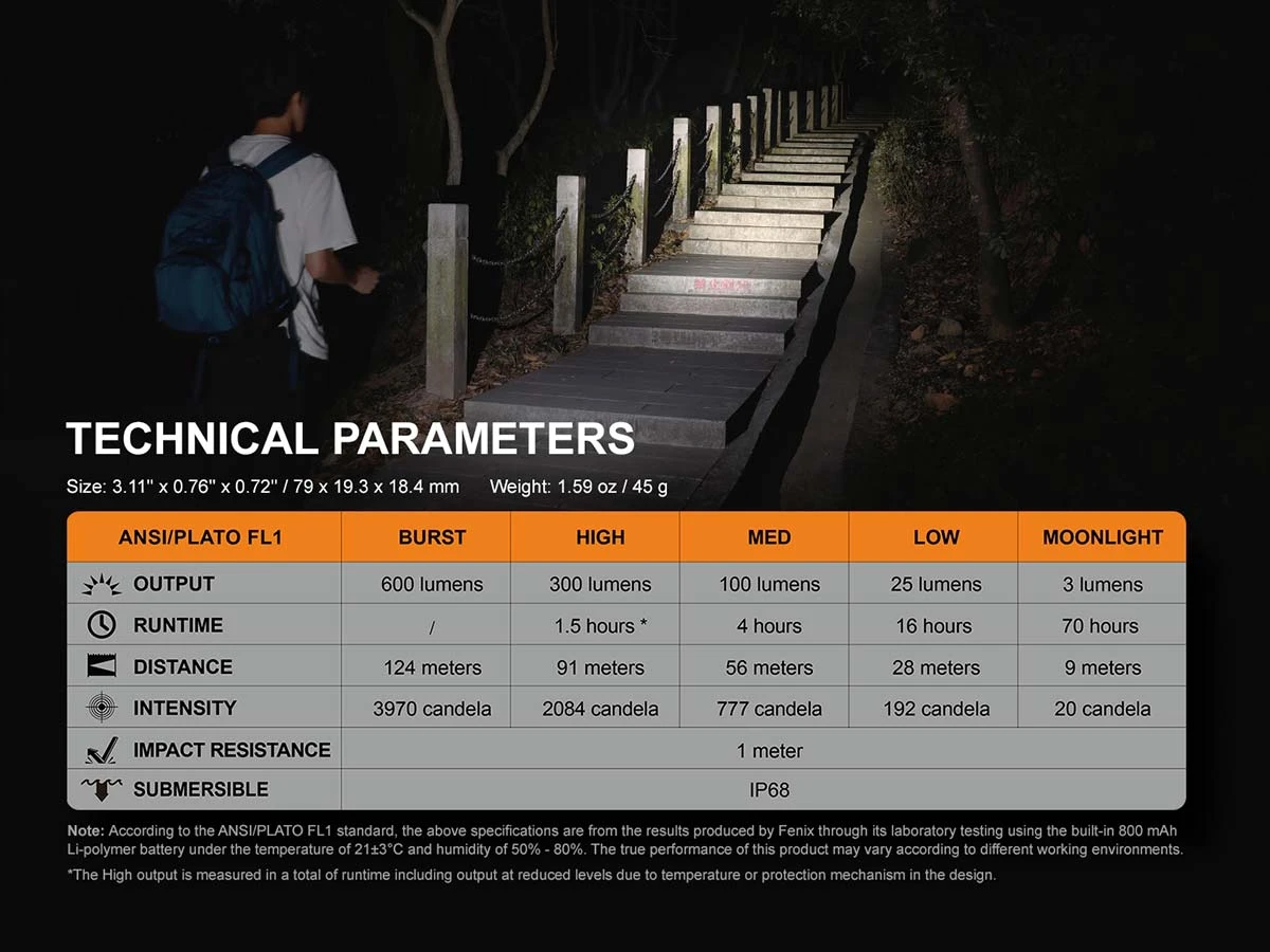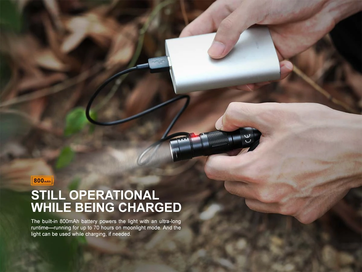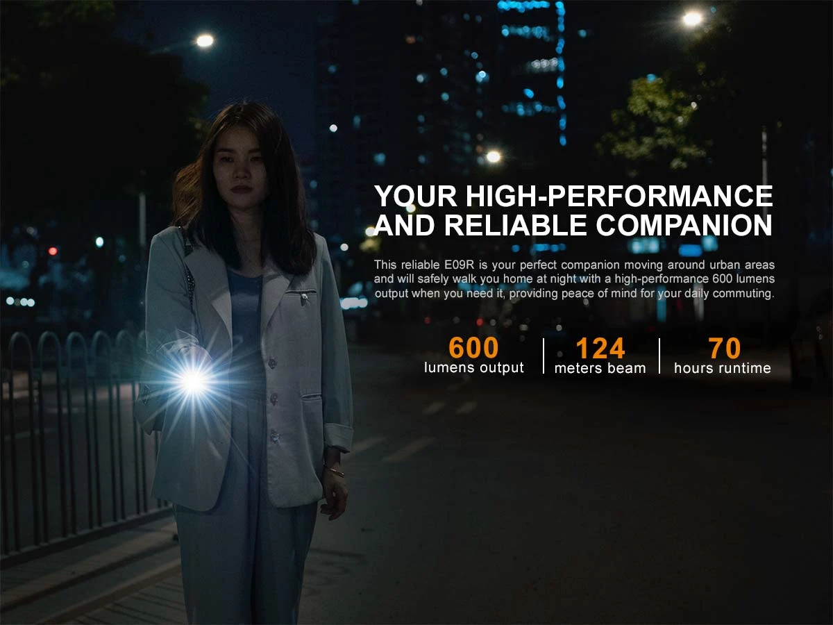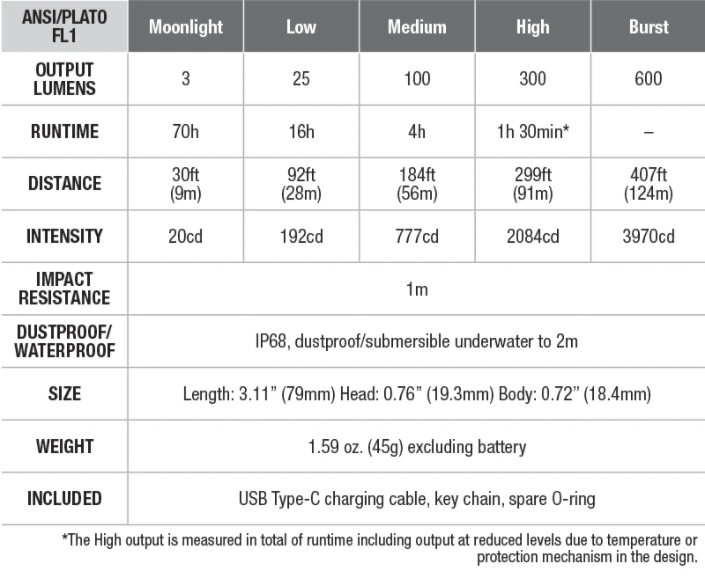 The Fenix E09R Rechargeable Flashlight is the perfect everyday carry companion. At only 3.1in long and less than 1in round, this small flashlight can easily light up your surroundings. The side switch lets you cycle through four brightness levels, including a Moonlight mode for up-close tasks that can last up to 70 hours. And when even more light is needed choose the Burst mode for a short 600 lumen burst of light. The built-in battery is USB Type-C rechargeable and the port is creatively hidden beneath the head to maintain appearance and create a dustproof and waterproof seal. Perfect for your pocket or your keychain, the Fenix E09R offers maximum illumination in a small EDC size.