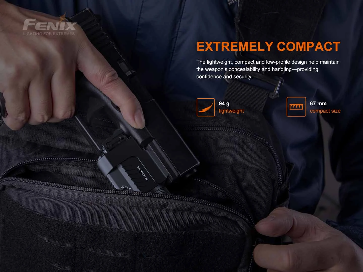 The Fenix GL22 is a versatile tactical mounted light that features a broad range of options. Featuring a Luminus SST20 LED + Red Laser, the GL22 has a maximum output of 750 lumens using the supplied 700UP battery or max 500 lumens when using a CR123A. The GL22 comes supplied with a GL and 1913 ( Picatinny) rail plate to mount on rail-equipped hardware. Key features of the GL22 light are ambidextrous switches used to access the white light and red laser and a momentary-on feature can also be used with either switch. The GL22 is compatible with Glock and Picatinny rails.