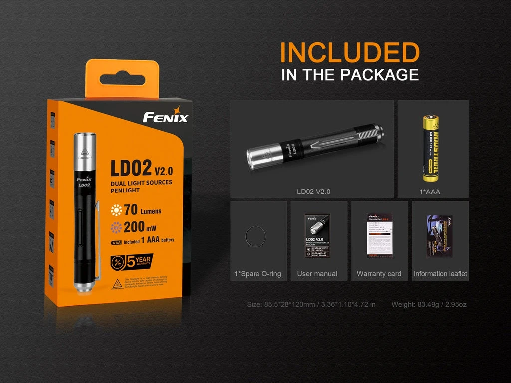 The LD02 V2.0 is a super compact EDC flashlight that features warm white and UV lights. It is fitted with a 90 CRI Cree XQ-E HI warm white LED and 365nm UV. One tail switch controls three output levels and the UV light output. Powered by one AAA battery, the light delivers a max output of 70 lumens. With a stainless steel tail switch for one-handed activation and output selection, and a light head also made of stainless steel, this exquisite and reliable penlight is the must-have for everyday carry, outdoor journeying and personal use.