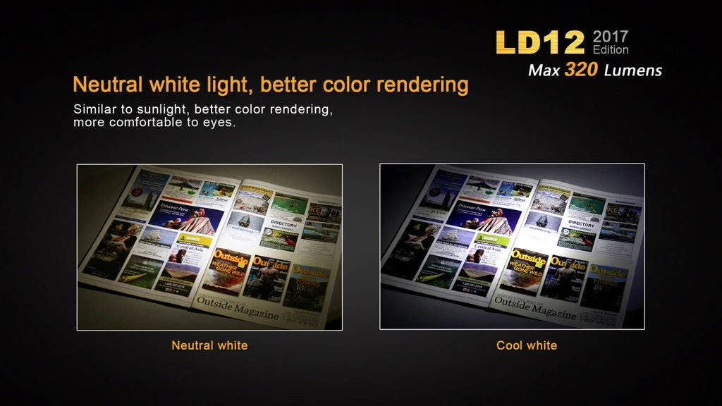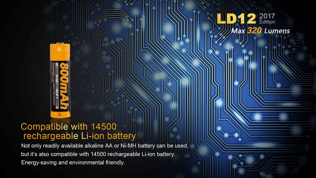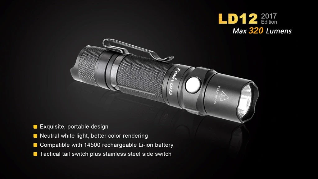 The redesigned Fenix LD12 is now compatible with 14500 rechargeable Li-ion batteries. It’s fitted with a CREE XP-G2 R5 neutral white LED for better colour rendering and delivers maximum 320 lumens. With four brightness levels plus strobe mode and convenient dual switch, the LD12 is definitely the must-have flashlight for everyday carry.