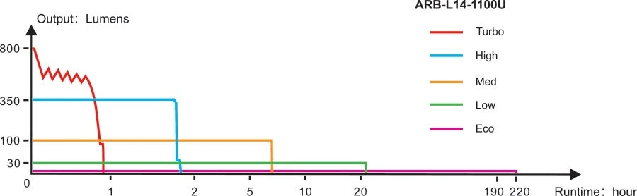 - Low: 30 Lumens / 22hrs 20min / 43m