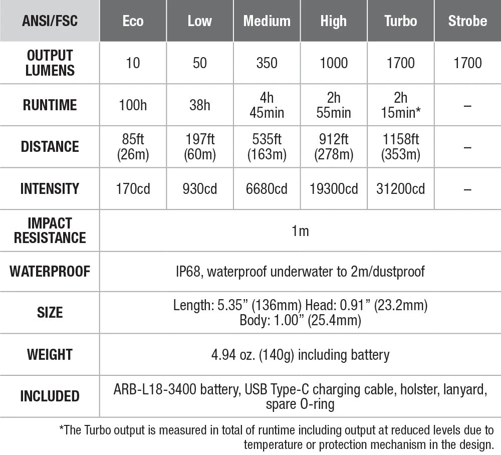 - Included: ARB-L18-3400 battery, USB Type-C charging cable, holster, lanyard, spare O-ring