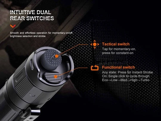 The new Fenix PD35R rechargeable flashlight is the upgraded replacement to the ever-so-popular Fenix UC35 V2.0 flashlight. Fitted with the Luminus SFT40 LED, the PD35R flashlight delivers a maximum of 1700 lumens at a distance of 1158 feet (353 metres). Operation is simple with the dual tail switches. Turn the light on and off with the large tactical switch and cycle through the six lighting modes via the smaller functional switch. The in-body USB-C charging port allows you to conveniently charge the included 18650 Li-ion battery (ARB-L18-3400) whenever the side mounted battery level indicator provides notice of a low battery. Compact and built-tough, the Fenix PD35R flashlight is IP68 rated; dust proof and waterproof underwater to two metres.
