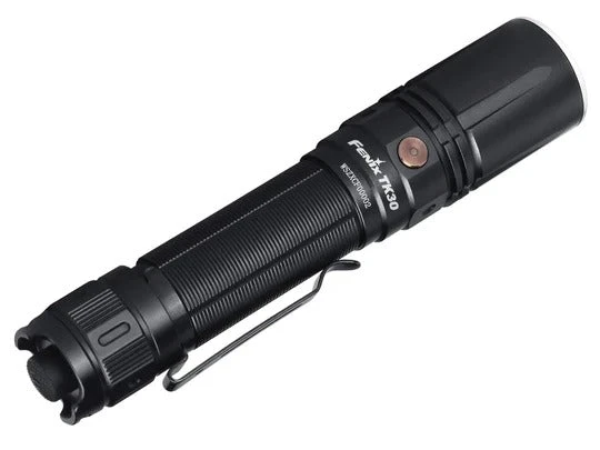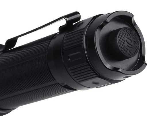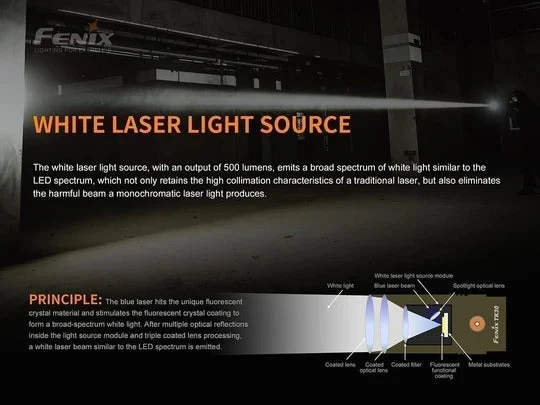 The Fenix TK30 is a white laser flashlight. A Class 1 laser stimulates a fluorescent crystal to create a broad spectrum white light, allowing this flashlight to throw 500 lumens at a jaw-dropping distance of 3937 feet (1200m)—that is 3/4 of a mile! The laser light creates a more focused spotlight beam, than a standard LED flashlight, with little spillover light. The tactical tail switch operates on/off and momentary on while the side switch operates the 3 lighting modes. Other features include a battery level indicator and it is IP68 rated dustproof and waterproof. Made for tactical applications where distance is a priority, the Fenix TK30 flashlight will not disappoint.
