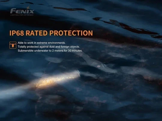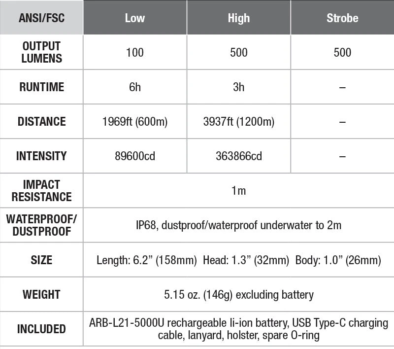 - Included: Fenix ARB-L21-5000U rechargeable li-ion battery, USB Type-C charging cable, lanyard, holster, spare O-ring
