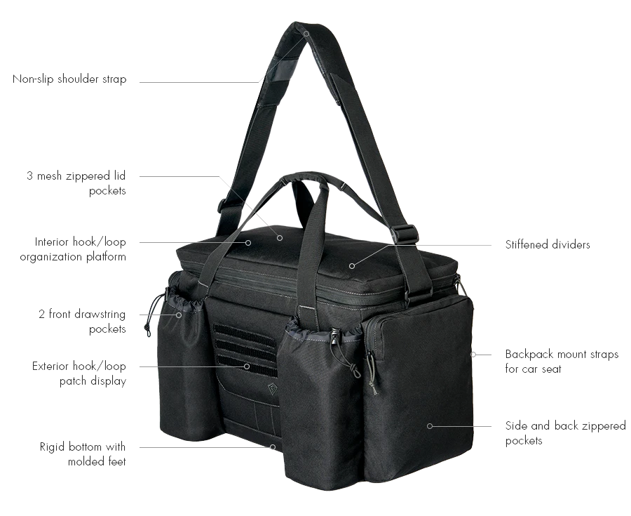 The fully functional Guardian Patrol Bag provides ample space for essential gear and supplies while on patrol. Durable 600D polyester and premium hardware provide a tough, sturdy exterior, while stiffened dividers and hard bottom for shape provide an unbeatably functional interior.