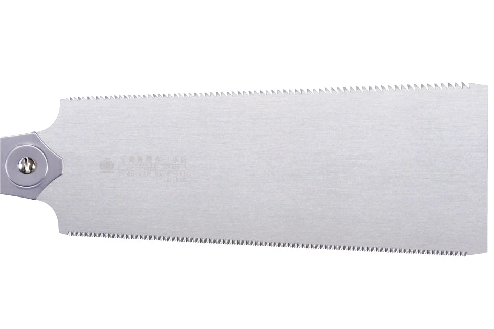 Double edge saw has cross cut teeth on one side and rip cut teeth on the other. With very thin blade and edges on rip cut teeth you can make very clean cuts. Used to cut though particle board (OSB), MDF panel, general timber, bamboo material, laminated wood, and composite wood panel.