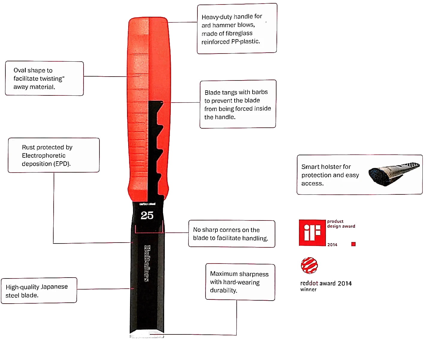 An everyday chisel – sharp, reliable and always at hand. Ready for tough precision and all-around use, from adjusting and fitting to prying and demolishing. Perfectly sharpened high-quality Japanese steel blade with heavy-duty handle designed for hard hammer blows. Smart holster with a clip for easy access at all times.