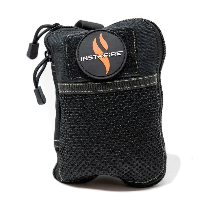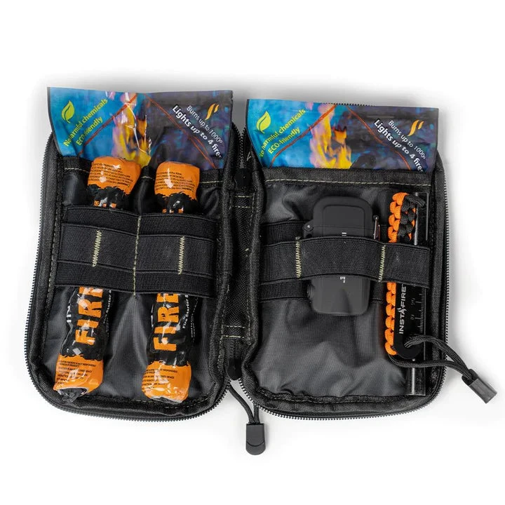 - InstaFire Fire-Starter Granule Pouches (x2) – Wind/water/snow-proof. Quickly produces a 1000 degree flame that boils water and cooks a meal, even without firewood.
