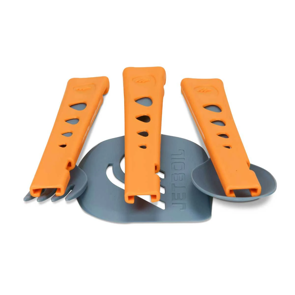 Enjoy the comforts of your dining table without hauling heavy silverware along, with the Jetset utensil set. Jetboil’s high-temperature nylon designs can withstand the heat, making them perfect for cooking and stirring food on your Jetboil cook stove. Reach every last bit of food at the bottom of your cup with the telescoping handles. Save pack space with the collapsible design, which stores compactly in or on Jetboil cooking vessels.