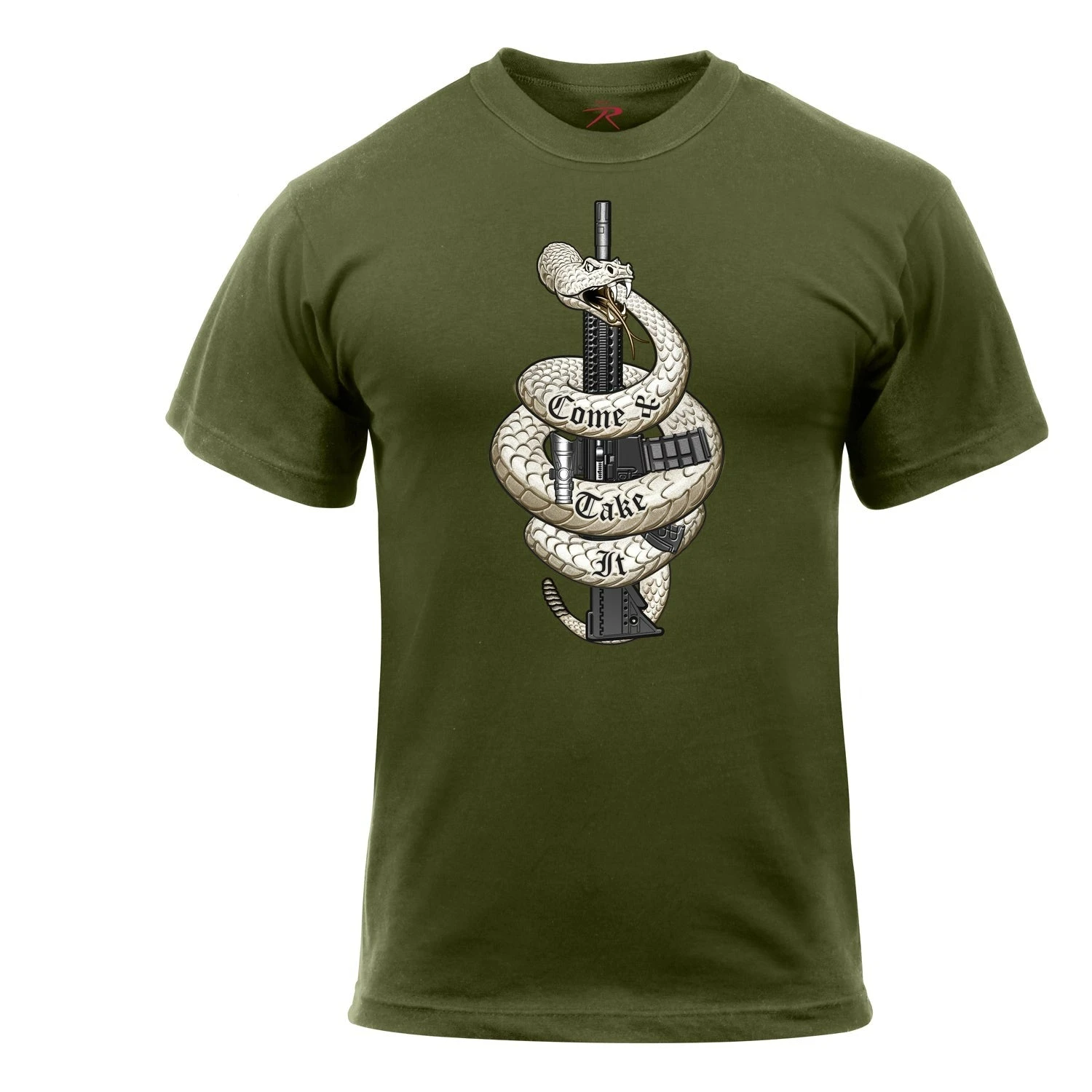 Rothco’s Come & Take It printed graphic t-shirt is a comfortable cotton/poly blended material. The front graphic features the iconic expression of defiance, Come and Take It, with a detailed image of a rifle and snake.