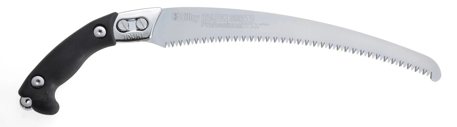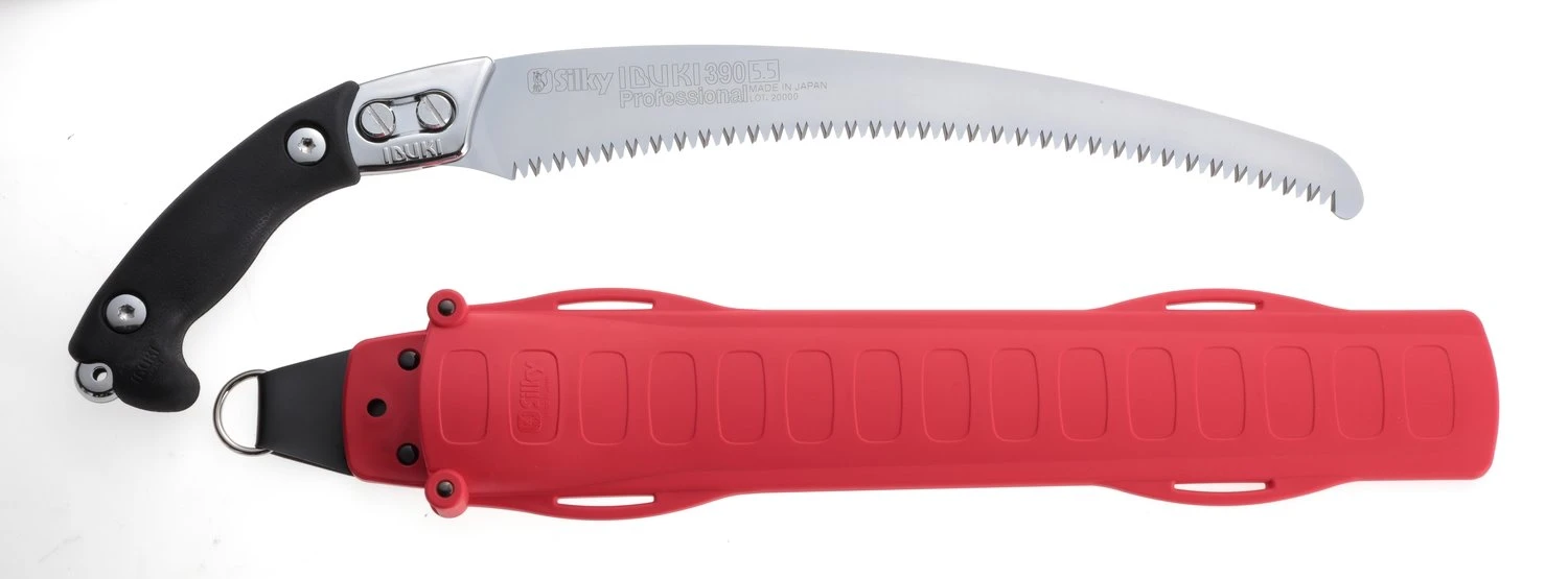Best-selling, heavy-duty, professional hand saw with a very well-balanced 15.4-inch, curved fixed blade. Large, comfortable sure-grip handle gives strength and flexibility to the full length of the saw. Curved blade provides a greater cutting speed with less effort. Utilizes proprietary Silky 4-RETSUME (Four Rows of Teeth) Technology. Teeth are set in such a way that there appears to be 4 rows of them. Ideal for the toughest pruning jobs! The heavy duty blade with precision-ground, razor-sharp, 5.5 teeth per inch is designed to cut on a pull stroke and provides fast, clean and extremely smooth cutting action. Superbly designed comfortable rubber hand grip absorbs vibration while cutting and provides excellent control over the full length of the saw. The hard chrome-plated blade resists rust and effects of tree resin, and wipes clean easily. Great combination of high performance blade with a comfortable sure-grip handle that really sticks in your hands. Exceptional design, strength, balance and superior finish quality. Comes with a custom black polypropylene sheath equipped with both ring and belt strap attachments that can be used on the left and right side and allow attachment to a tree saddle using carabiner. Suitable for serious pruning tasks and ideal for aggressive cutting and efficient chip removal. Made in Japan.