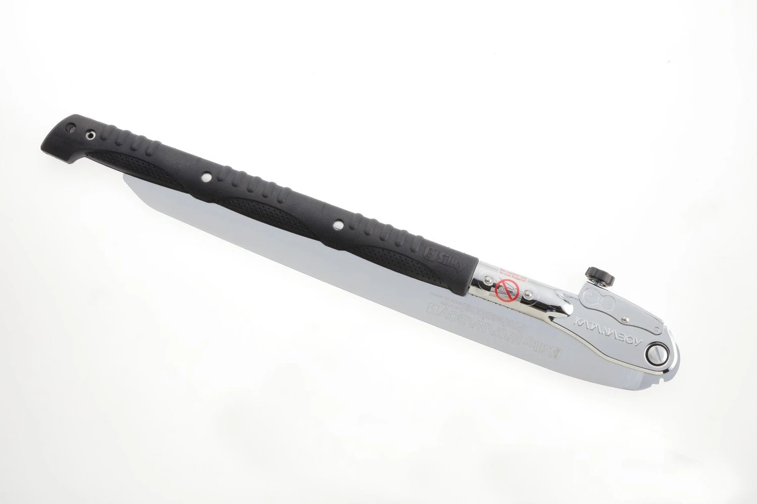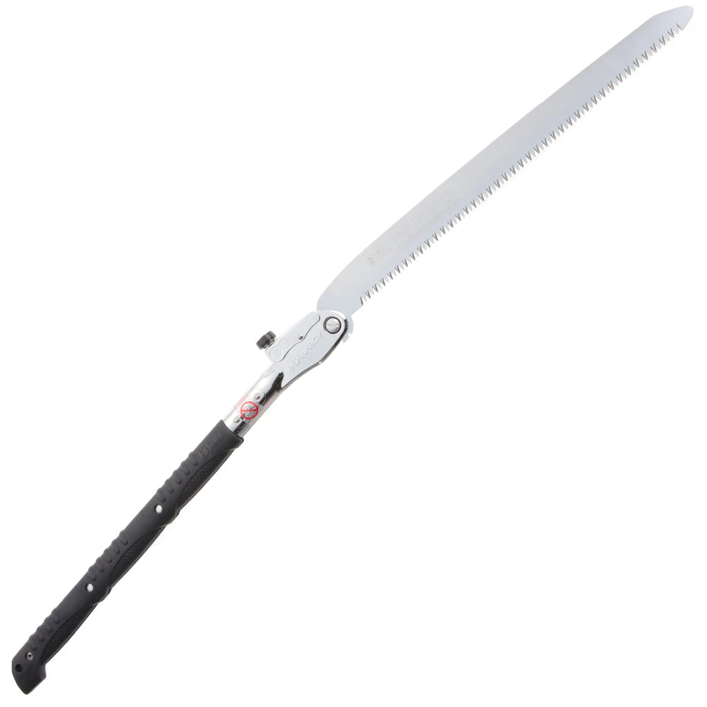 Two-handed, professional, heavy-duty folding saw with a 19.8 inch blade. Can easily compete with a chainsaw! Compared with the Katana, the legendary Japanese samurai sword, it is the largest folding saw on the market today. The long, well-balanced, taper-ground blade with an impulse-hardened, non-set tooth design provides extended working reach, faster cutting and handles large limbs and trunks with no effort. The non-slip, two-handed, rubberized cushioned handle provides a sure and comfortable grip even in the most difficult operating conditions. Suitable for serious tasks like cutting large timber and tree trunks. Exceptional design, strength, balance and superior finish quality. Comes with a sturdy nylon shoulder bay with Velcro fastening and a pocket for replacement blades. Made in Japan.
