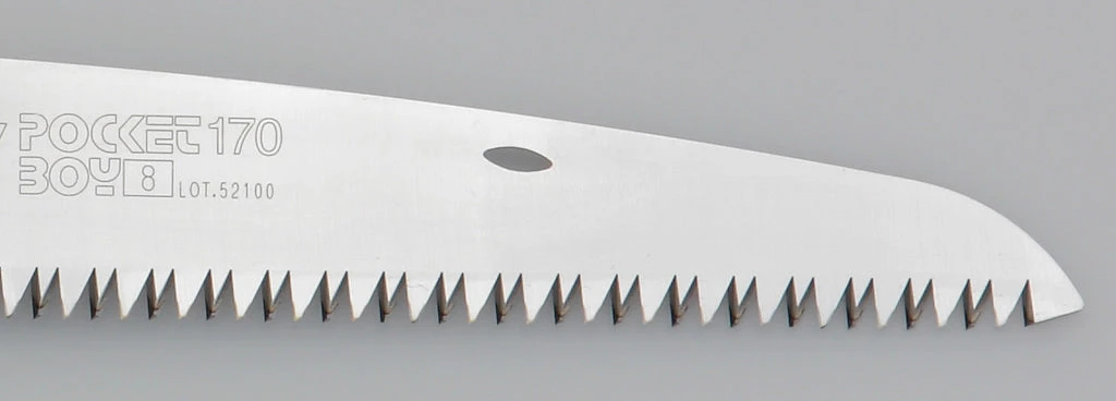 Don’t let its size fool you. This compact little saw has precision-ground, razor sharp teeth! 6.75 inch blade and 7 teeth per inch of electronically hardened cutting surface. The Pocketboy 170 Large Tooth is hard chrome treated to resist the effects of rust and tree resin. Blade locks in two positions for straight and flush cutting. Medium, Fine and Extra Fine blades are also available for this handle but are sold separately. Made in Japan.