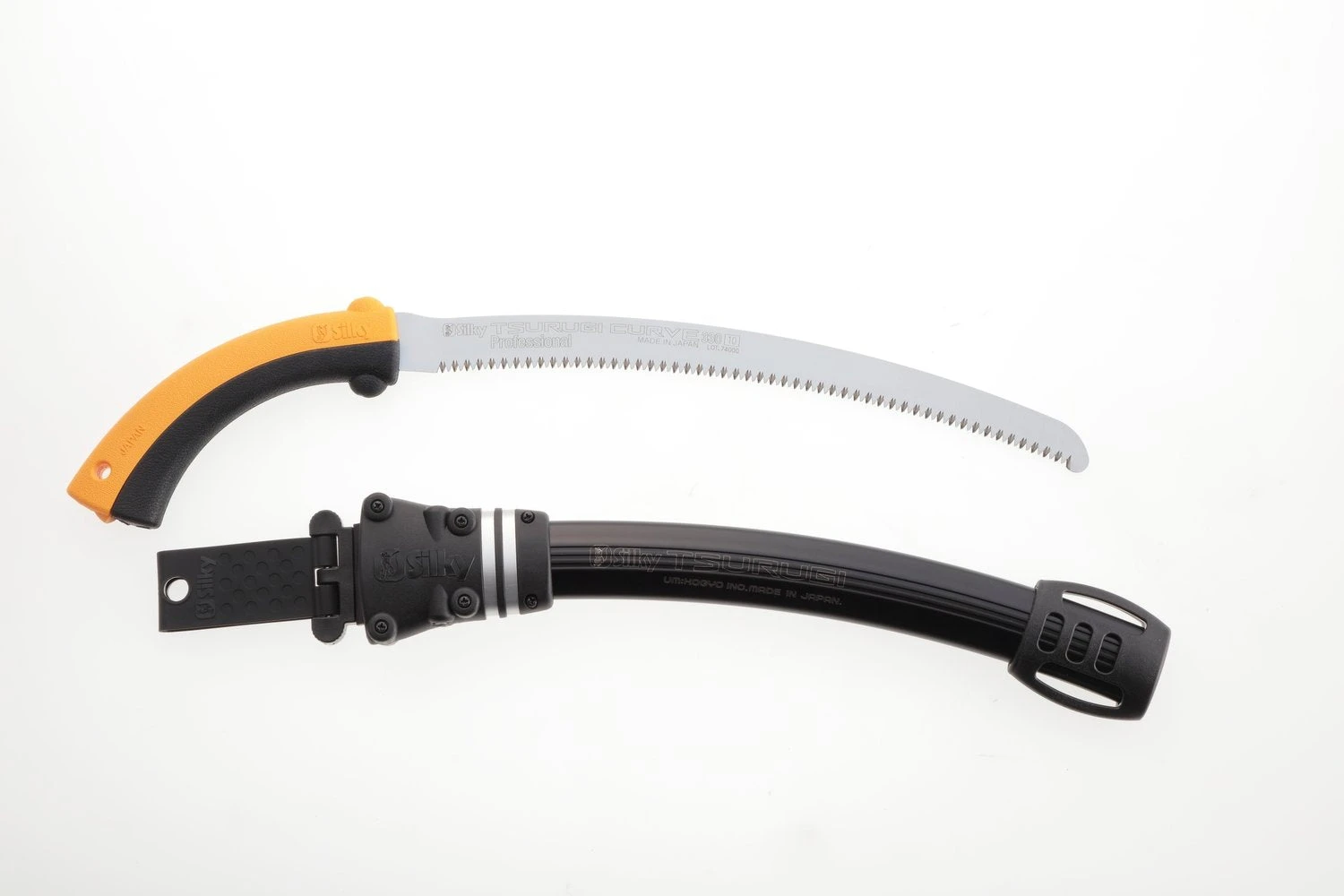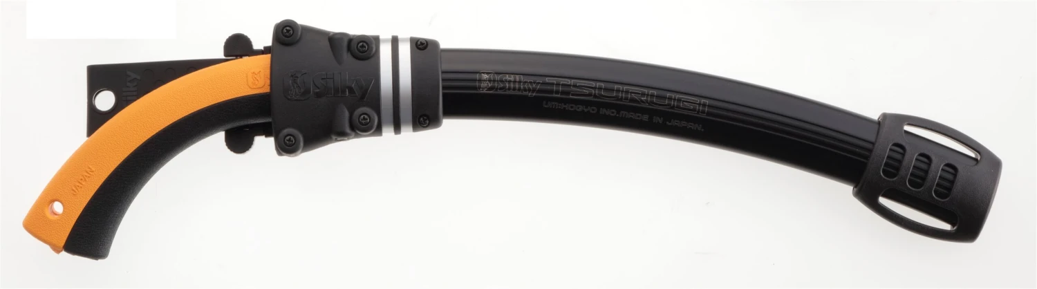 The Tsurugi Curve is similar to the uniquely designed straight Tsurugi, but is a much more aggressive impulse-hardened blade in popular sizes which will still fit into tight crotches without damage to opposing limbs. The Tsurugi is possibly the lightest weight, best balanced “big saw” ever produced, having no handle screws, nuts or extraneous hardware to keep it together. The comfortable, 2-part rubber grip is held together by an ingenious integration with the full tang blade. The Tsurugi Curve comes in a unique aluminum scabbard that can be attached to the belt or leg depending on the user’s preference, and has eight rollers protecting the entryway.