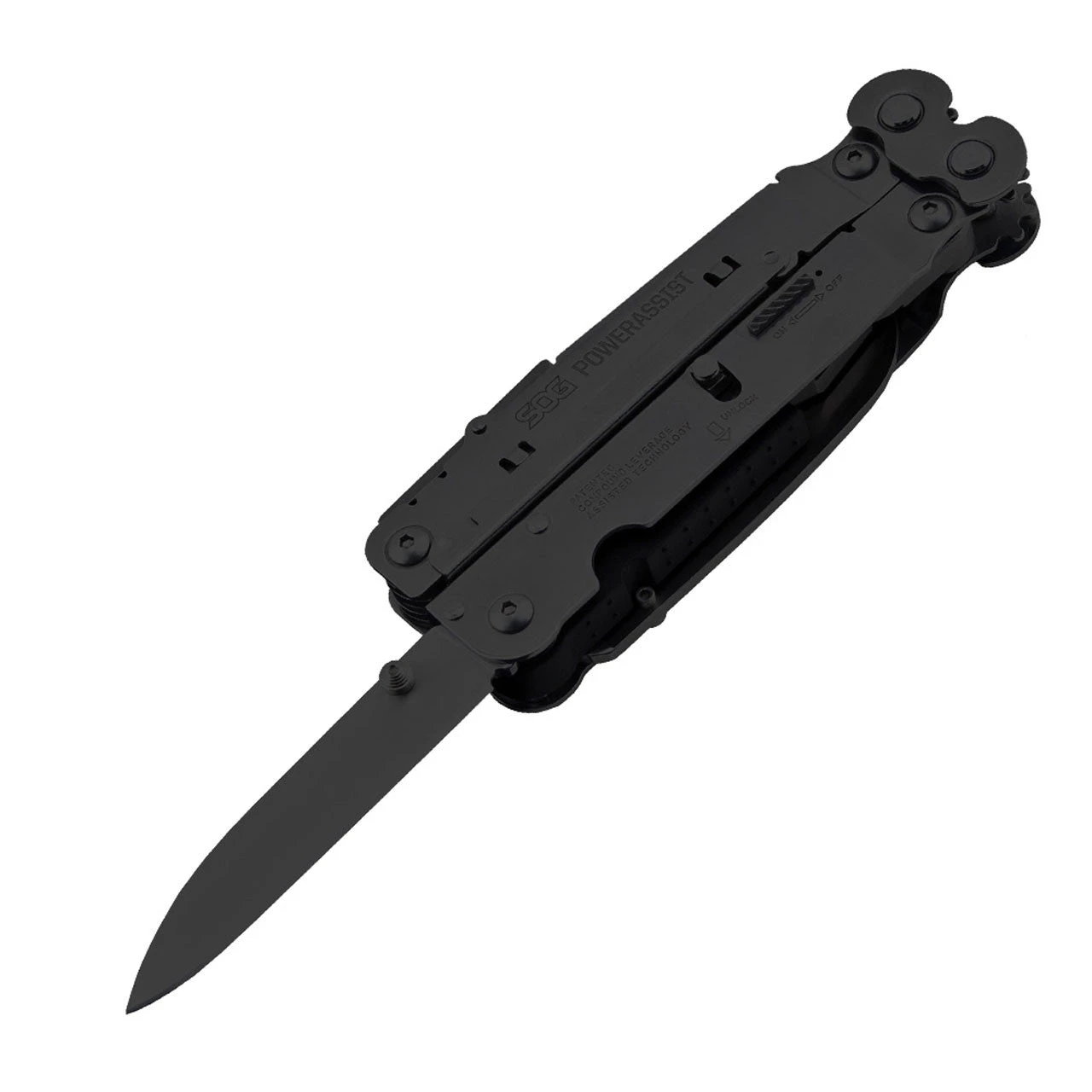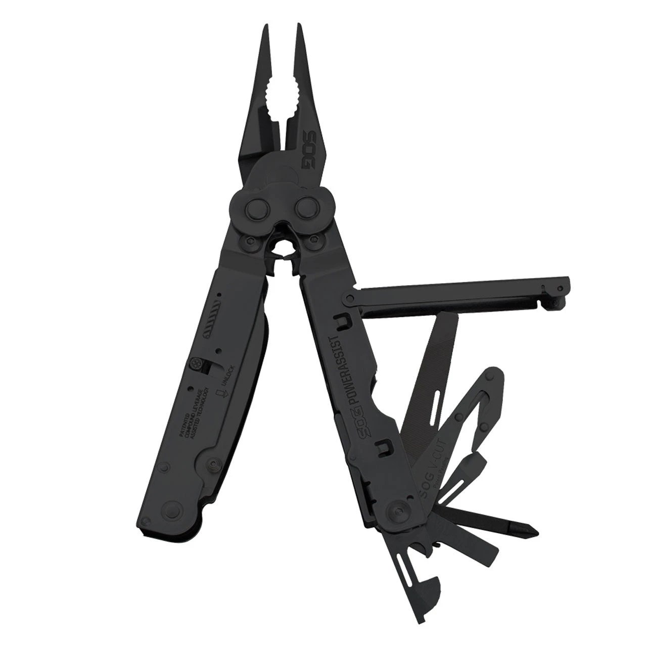 The PowerAssist takes multi-tools to a new level. This is the first in the world to house not just one but two SOG Assisted Technology blades. Start to open the main blades, which are available when the main tool is closed, and S.A.T. takes over to complete opening. When not in use, these blades lock closed using our patent pending side release. Flip open the tool and experience the precision of the heavy-duty plier capability and large wire cutters. Smooth handle surfaces promote comfort on even the toughest jobs. Also includes Compound Leverage gear covers, heavy-duty construction, V-Cutter, built-in crimpers and a matte black finish for low reflectivity.
