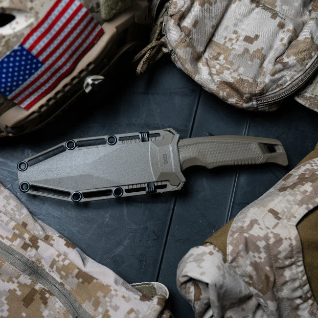 A wholly modern fixed-blade duty knife, Recondo FX can trace its warfighter lineage back to the origins of SOG. The overmoulded rubberized grip allows for optimal hand grips at all angles in virtually all environments. The full-tang CRYO 440C stainless steel blade has outstanding corrosion and wear resistance. SOG’s UMS-compatible sheath is ambidextrous and provides multiple mounting options and features a tool-less tension adjustment system allowing for the perfect draw. Versatile and adaptable, the whole world serves as Recondo FX’s drop zone.