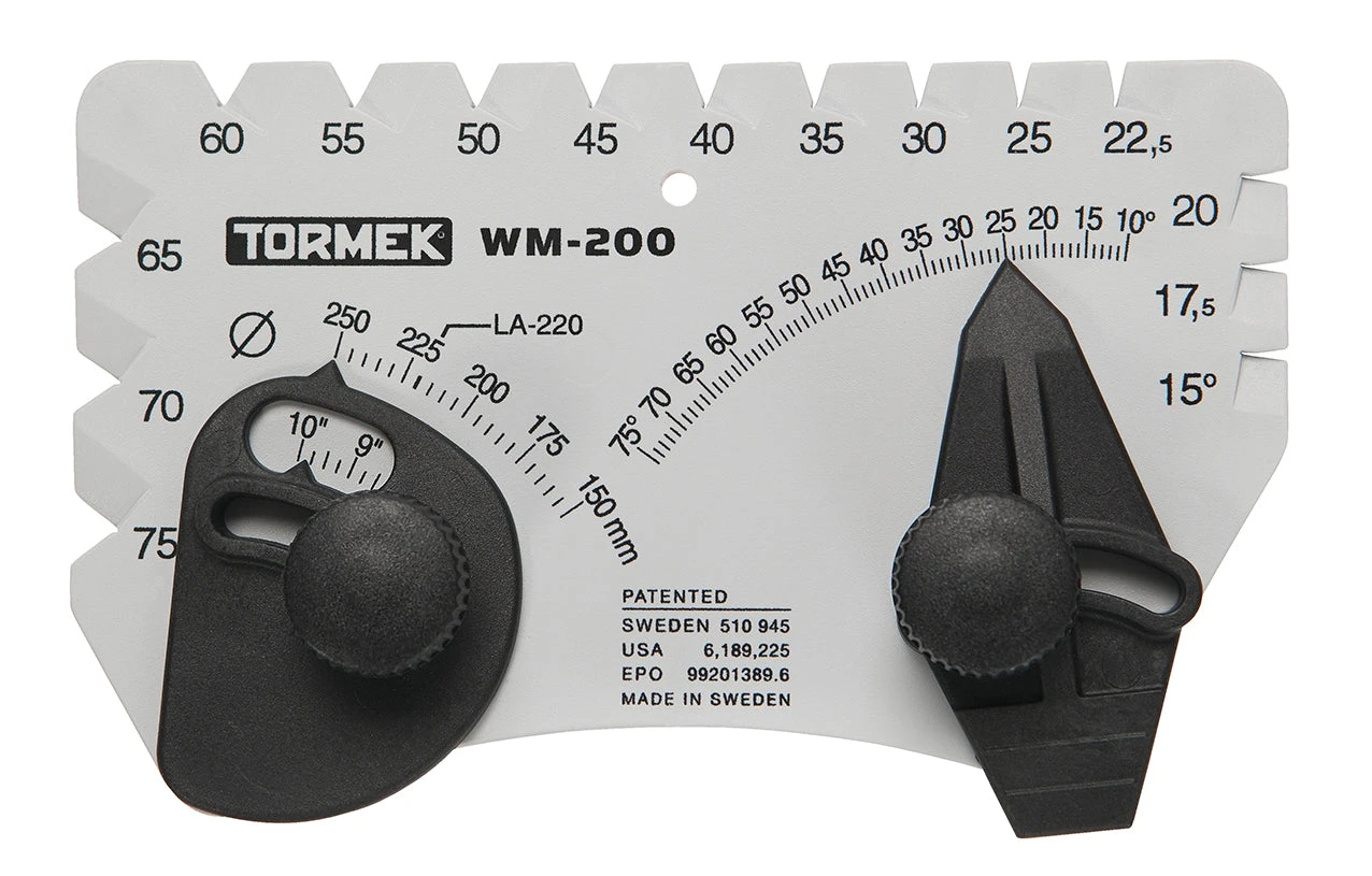 The AngleMaster is designed to work on any grindstone diameter from 250mm (10in) down to 150 mm (6in). You achieve an exact setting irrespective of the degree of stone wear.