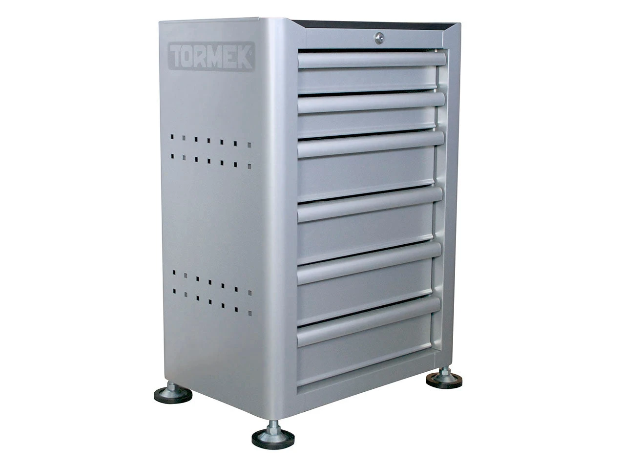 Top quality sharpening cabinet with purposed designed drawers to fit the Tormek accessory kits. Sturdy steel design with scratch resistant metallic coating, rounded corners and Tormek logotype. Fits easily into your workshop and you will be able to adjust it to your ideal working height.