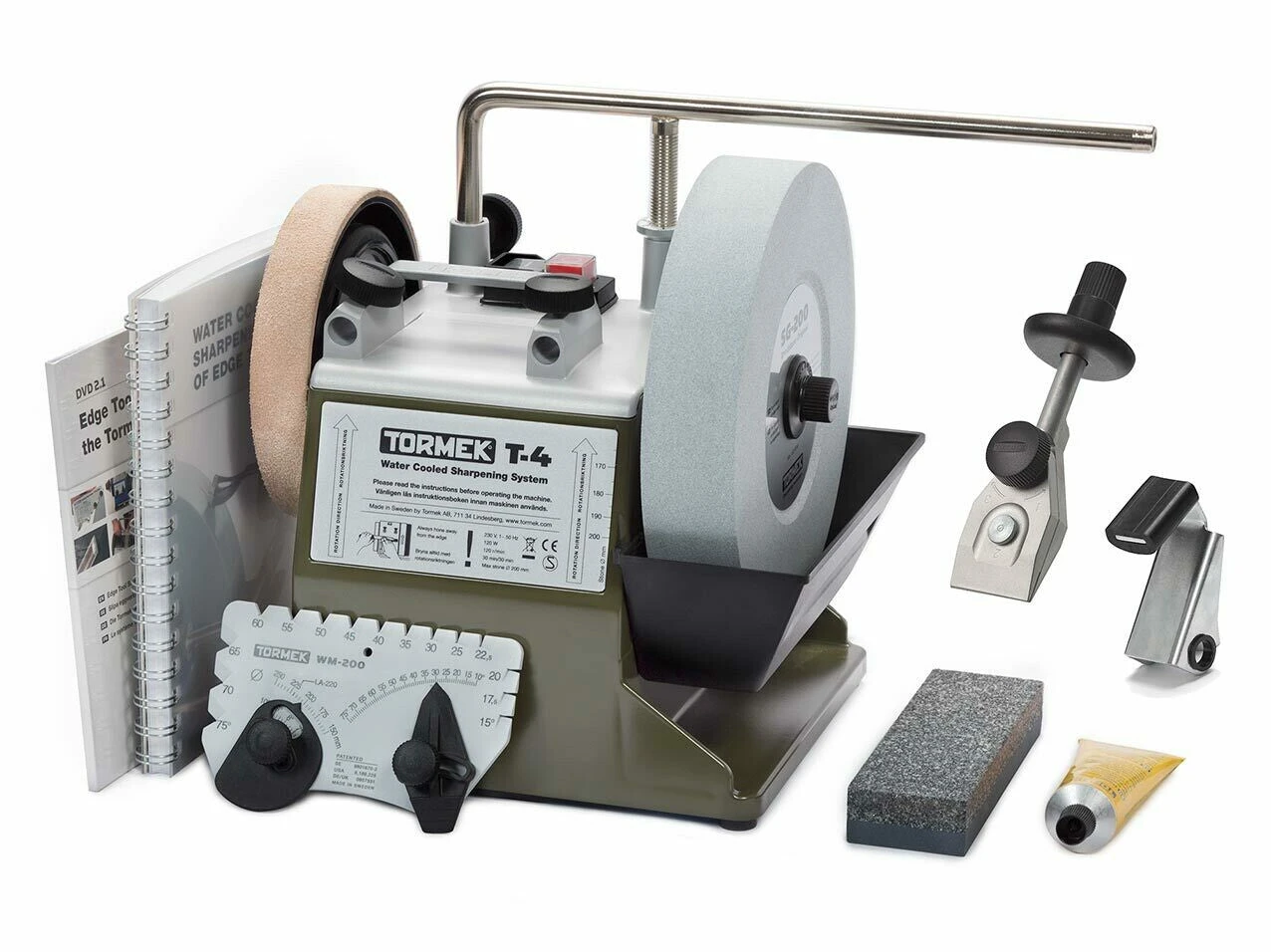 The Bushcraft package includes the jig for knife sharpening SVM-45, jig for axe sharpening SVA-170, together with all the standard accessories: Stone Grader SP-650, AngleMaster WM-200, Honing Compound PA-70, EM-15 Edge Marker to colour the bevel when setting the edge angle, instructional DVD and Tormek Handbook.