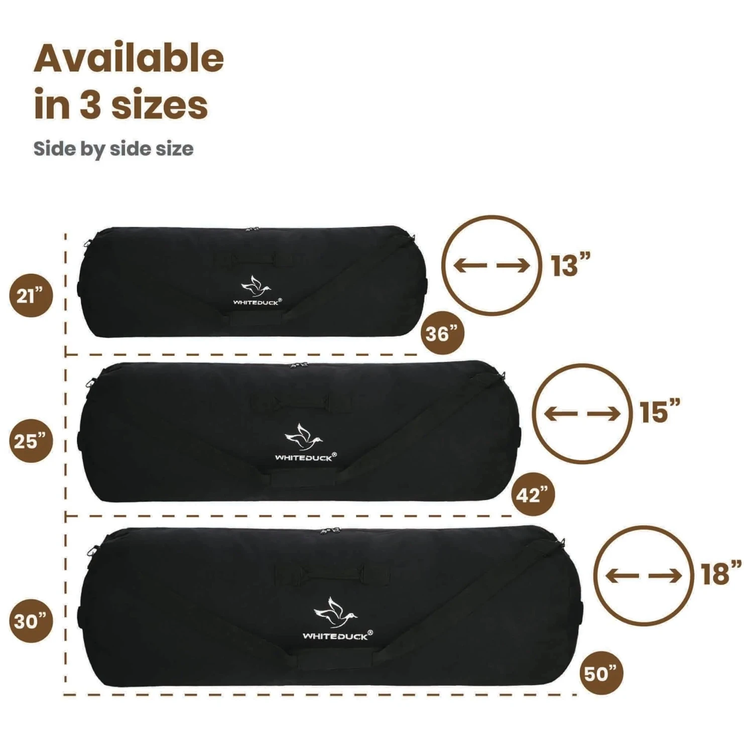 The Hoplite Duffel Bags are military-style duffels made from 100% premium, 18oz canvas. They’re super durable and spacious and perfect for a variety of uses like travel, weekend trips, moving or storage. The Hoplite Duffel Bags feature a removable padded shoulder strap, military-grade full-length zippers and carry handles on both sides.